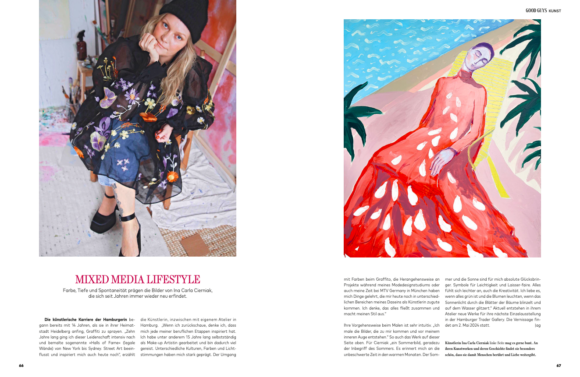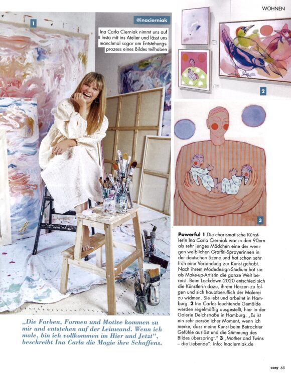 Die Hamburger Künstlerin schafft es, mit ihrem Werk all das auf die Leinwand zu bringen. Sie schafft es, uns mit ihrer Kunst zu berühren. Die ebenso farbenfroh leuchtenden wie ausdrucksstarken Bilder strotzen vor Lebensfreude. Sie sind lebhaft und feminin. Farben und Formen werden gelayert, schieben sich ineinander. Alles ist verbunden. Die Kostbarkeit des Moments und der Intuition stehen im Vordergrund. In einer Welt, in der viel geplant und in die Zukunft gedacht wird, möchte Ina Carla Cierniak beim Malen völlig frei davon sein.
